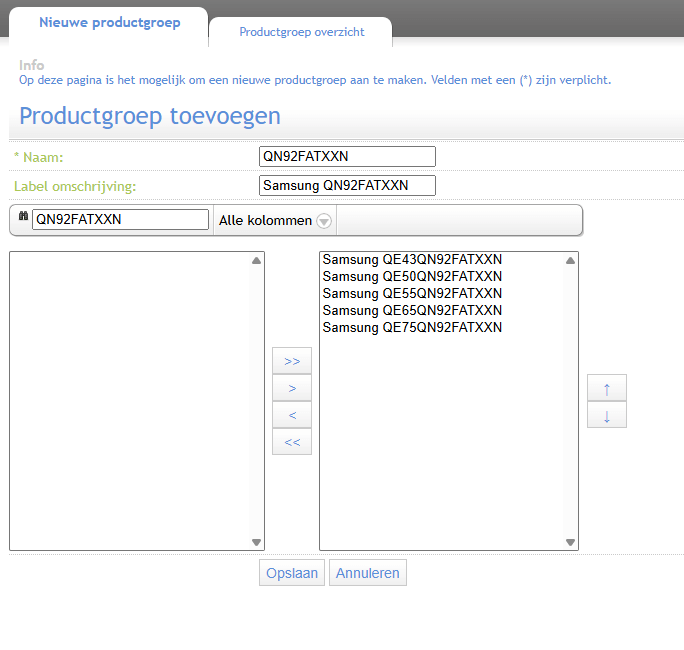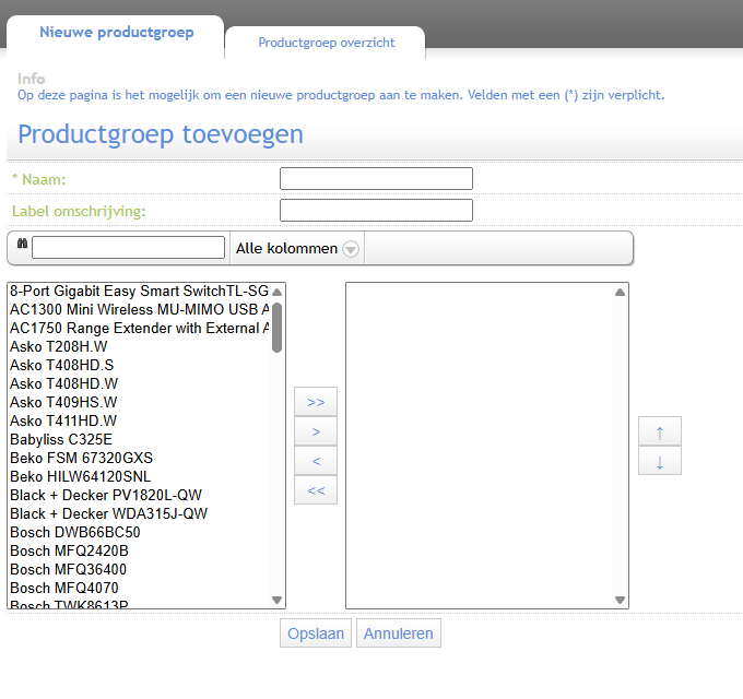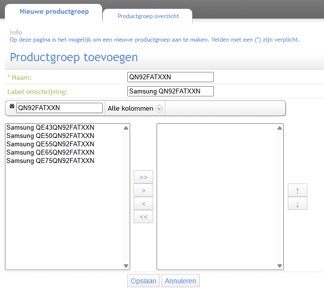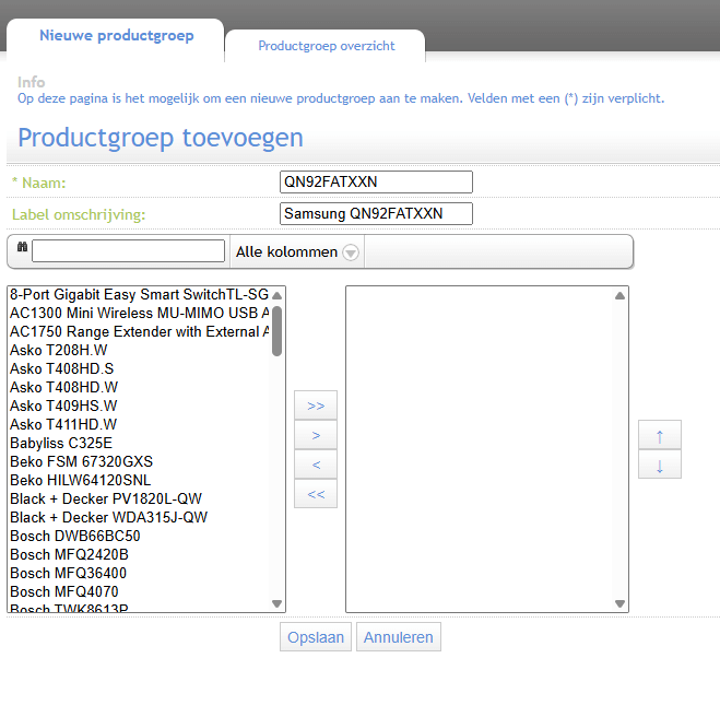 - Selecteer de producten die in de groep wilt zetten en druk op de “>” knop. Indien alle producten uit het filter overgezet moeten worden, druk je op de “>>” knop. Wil je er producten uithalen, dan kun je je de “<” of “<<” knop gebruiken.